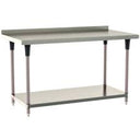 Heavy-duty stainless steel worktable engineered for commercial kitchens and food preparation environments. Features a 24" x 36" work surface with integrated backsplash to contain splashes and spills, reinforced stainless steel undershelf for additional storage capacity, and sturdy legs for stable, elevated positioning. Corrosion-resistant construction ensures durability in high-moisture settings. Ideal for restaurants, catering operations, and institutional food service facilities requiring reliable, sanitary work surfaces.