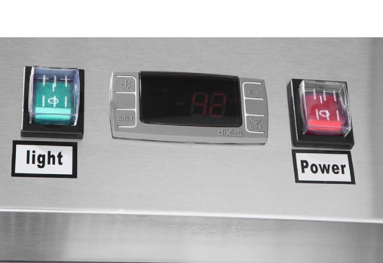 This product features a durable stainless steel exterior and interior, equipped with LED interior lights for enhanced visibility. It operates with a heavy-duty Embraco compressor using environmentally friendly R290 refrigerant and is controlled by a Dixell digital controller. Designed to maintain optimal temperatures between 33°F and 38°F, it includes self-closing doors with an automatic stay-open feature, recessed door handles, a magnetic door gasket, and a double pane glass door. The unit comes with pre-installed casters for easy mobility and has a standard NEMA-5-15P plug. Each section is supplied with four pre-installed shelves, while models MCF8705GR and MCF8707GR also include standard door locks (note: this feature is not available on the sliding glass door model MCF8709GR). Optional features include extra shelves with four shelf clips per shelf, with a specific part number for the MCF8707GR. This product is supported by a two-year parts and labor warranty, alongside a five-year warranty for the compressor, ensuring peace of mind and reliability for users.