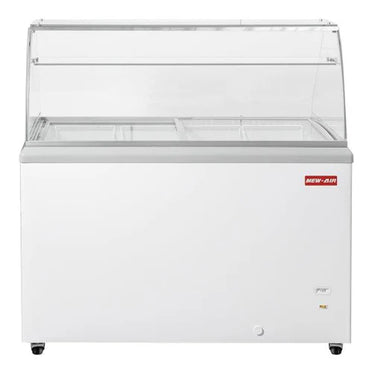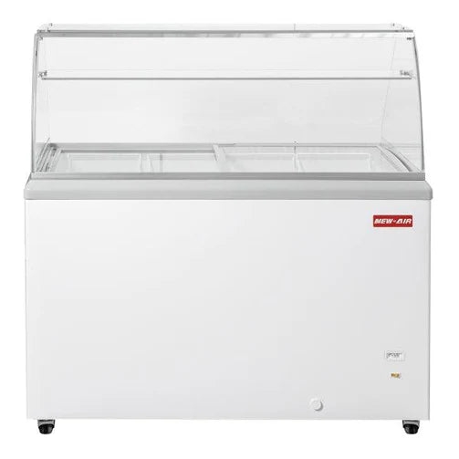 he New Air NIF-50-DC is a 50" ice cream dipping cabinet with a canopy, or sneeze guard. Its storage capacity is 8.4 cubic feet, and it fits 8 tubs of ice cream. On the top of the unit are sliding glass doors that allow for ease of use and viewing. This New Air ice cream cabinet comes equipped with anti-condensation and frosting technologies. The temperature is adjustable, and the refrigerant is R290. Ultimately, the NIF-50-DC is a great front of house merchandiser with the ability to store your products at an ideal temperature.