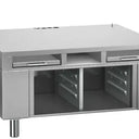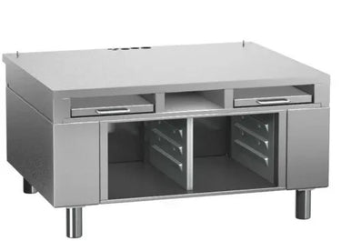 Stand, 43-1/4"W x 35-1/4"D, 22-3/8" to 30-1/4" adjustable height, (2) pull out shelves, (2) sets of rails for 12" x 20" pans, top & side panels, with electric height adjustable feet by 7-7/8", for size 2-S