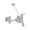The wall mount faucet for mop sink WM08MP includes a 6 1/2" spout, an 8" adjustable centre, a heavy cast spoot with a pail hook and a 3 1/4 garden hose thread and lever handles. It supports brackets